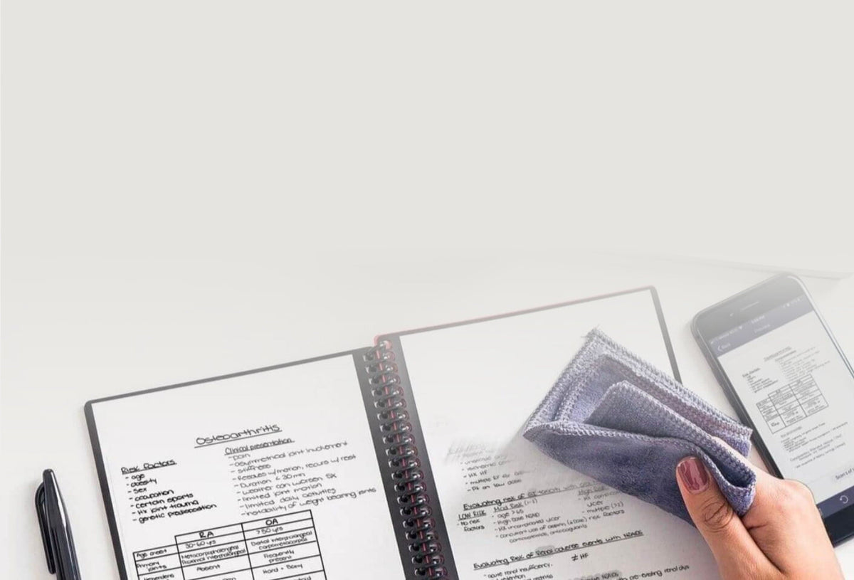 Each Rocketbook can replace up to 100 or more paper notebooks. Simply write with Pilot FriXion pens, then erase the pages with a damp cloth to reuse again & again. The free Rocketbook app makes it a snap to save your notes to the cloud.