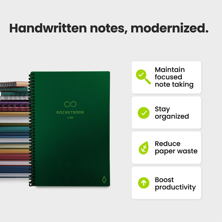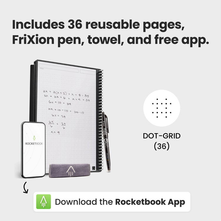 • New and Improved Core: Features premium reusable paper, with improved pen to paper feel, spiral binding and sleekly re-designed, scratch-resistant cover. Grid layout pages now include Smart Titles and Smart Tags to name and organize files efficiently. Create, Digitize, Erase, Re-Create: Capture ideas with the included Pilot Frixion Pen, digitize effortlessly using the Rocketbook app, store in your preferred cloud service. When done, simply wipe the pages clean with a damp cloth and start fresh.