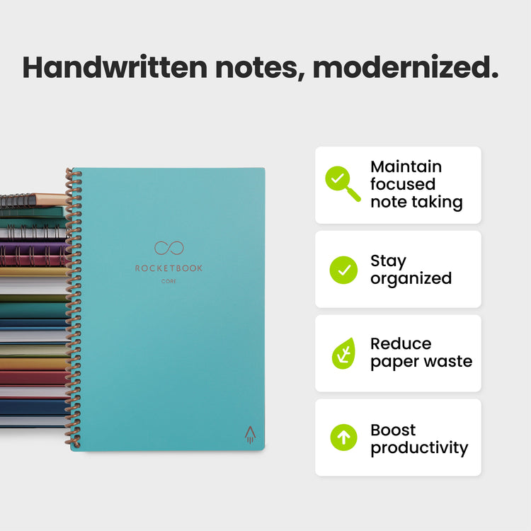 - New and Improved Core: Features premium reusable paper, with improved pen to paper feel, spiral binding and sleekly re-designed, scratch-resistant cover. Grid layout pages now include Smart Titles and Smart Tags to name and organize files efficiently. Create, Digitize, Erase, Re-Create: Capture ideas with the included Pilot Frixion Pen, digitize effortlessly using the Rocketbook app, store in your preferred cloud service. When done, simply wipe the pages clean with a damp cloth and start fresh.