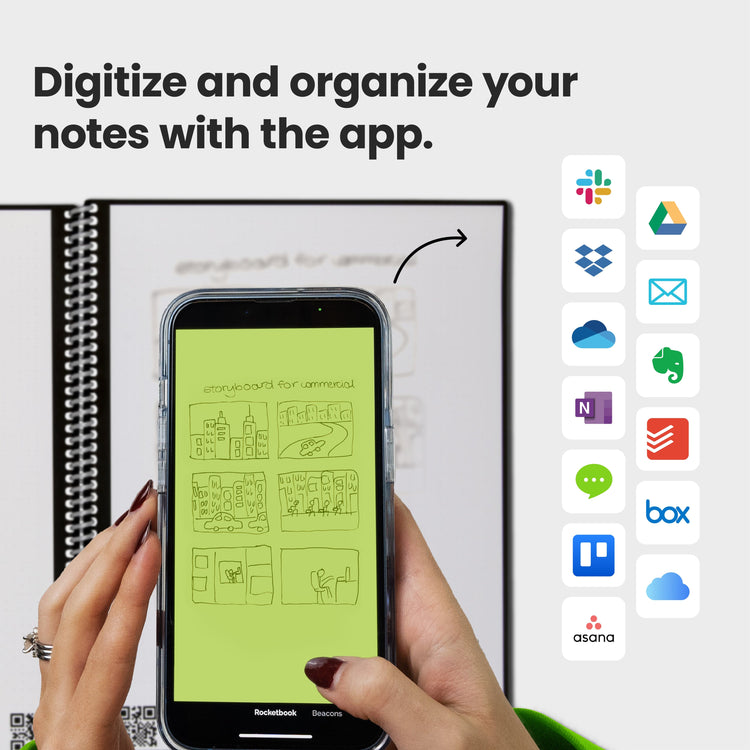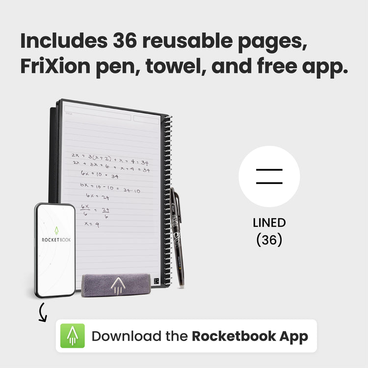 • Write, Digitize, Erase, and Re-Write: Write notes with the included Pilot Frixion Pen, digitize effortlessly using the Rocketbook app, store in your preferred cloud service. When done, simply wipe the pages clean with a damp cloth and start fresh.